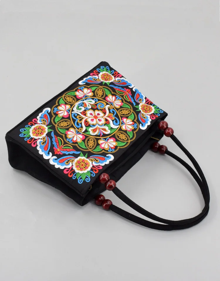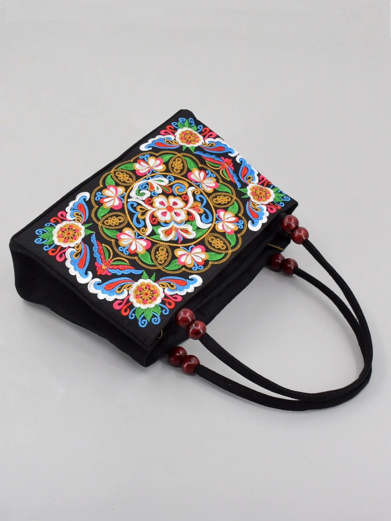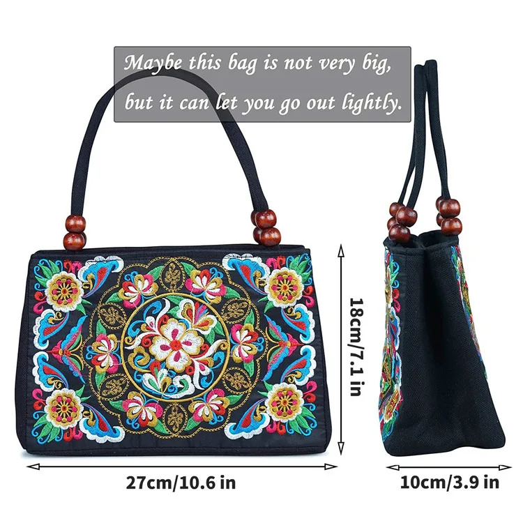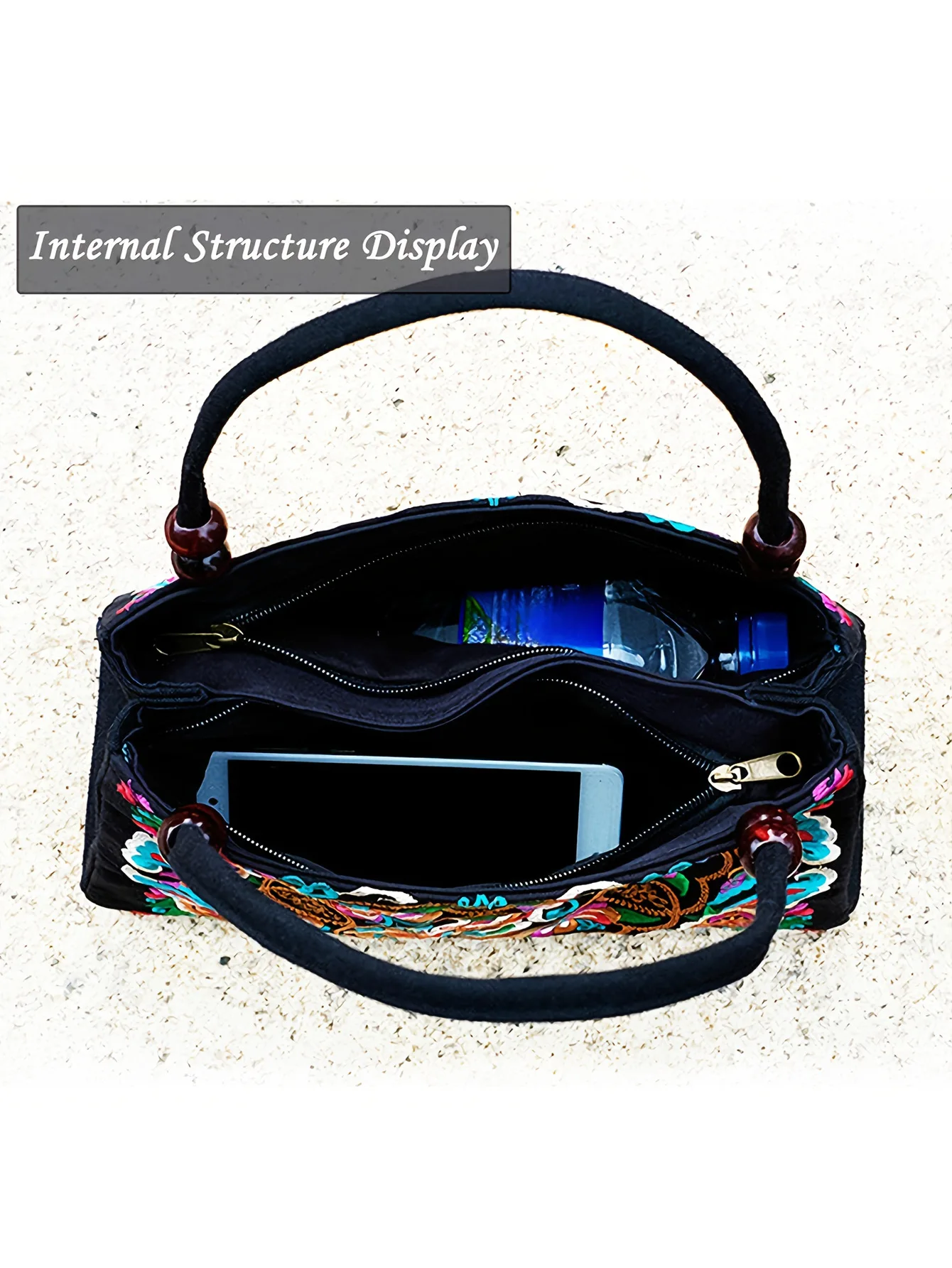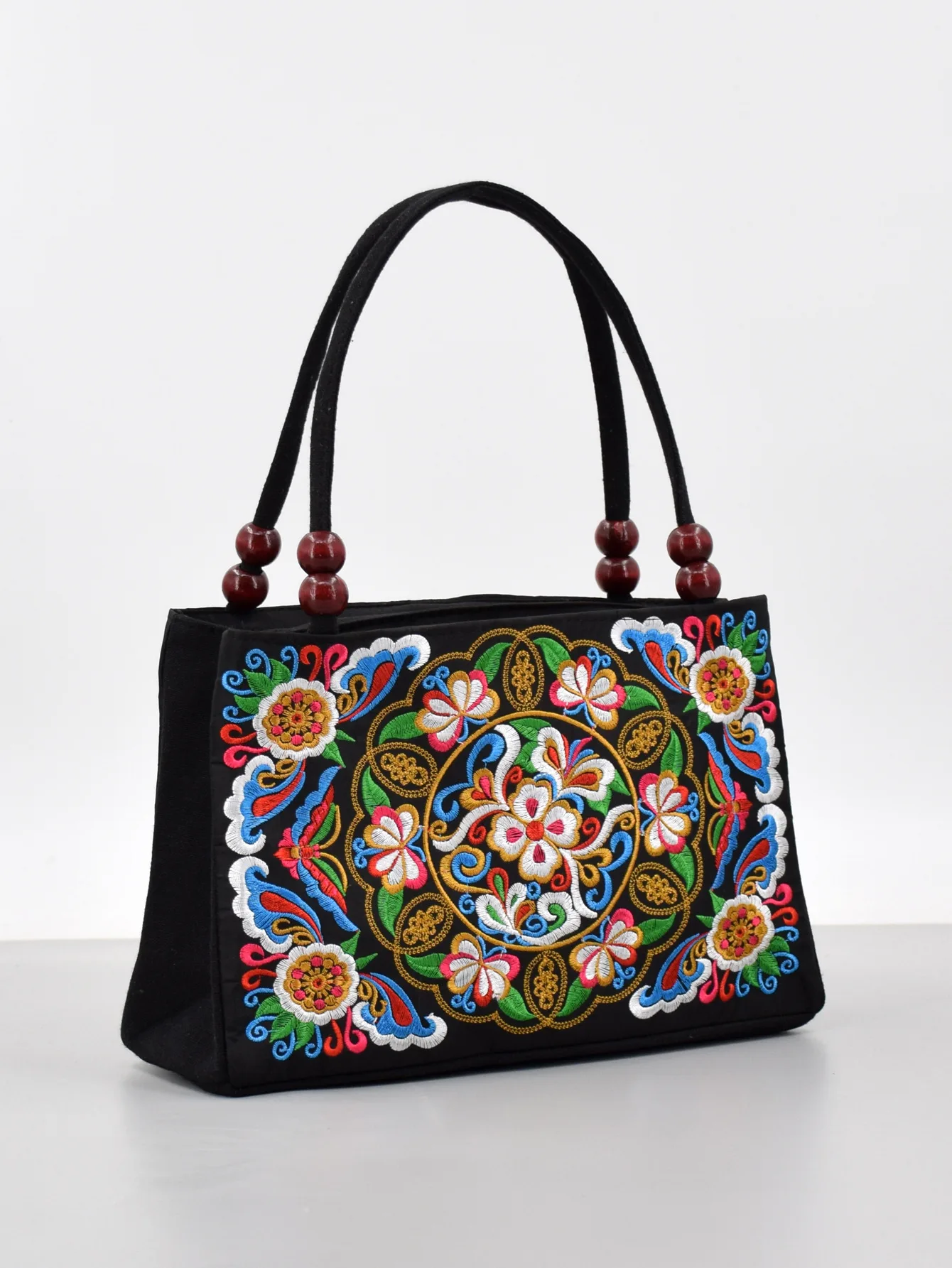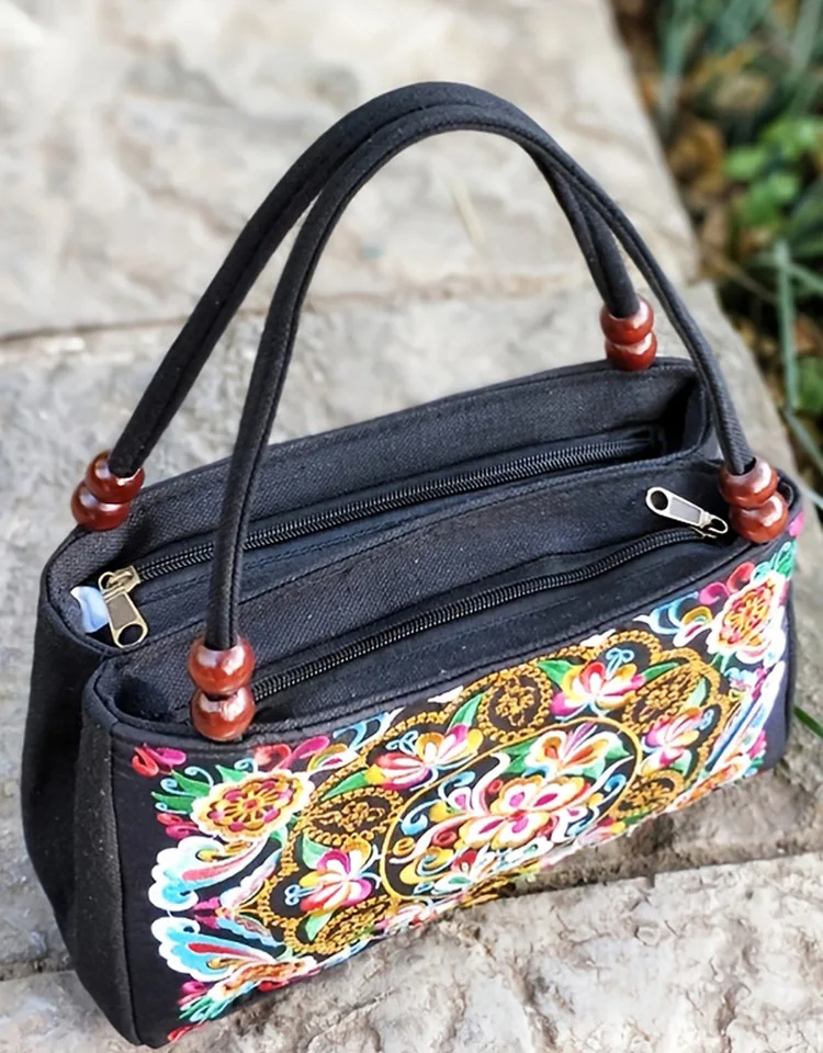 Ethnic-style Double-sided Embroidered Handbag Wooden Bead Accessories Zipper Hand Canvas Bag Portable Mobile Phone Wallet