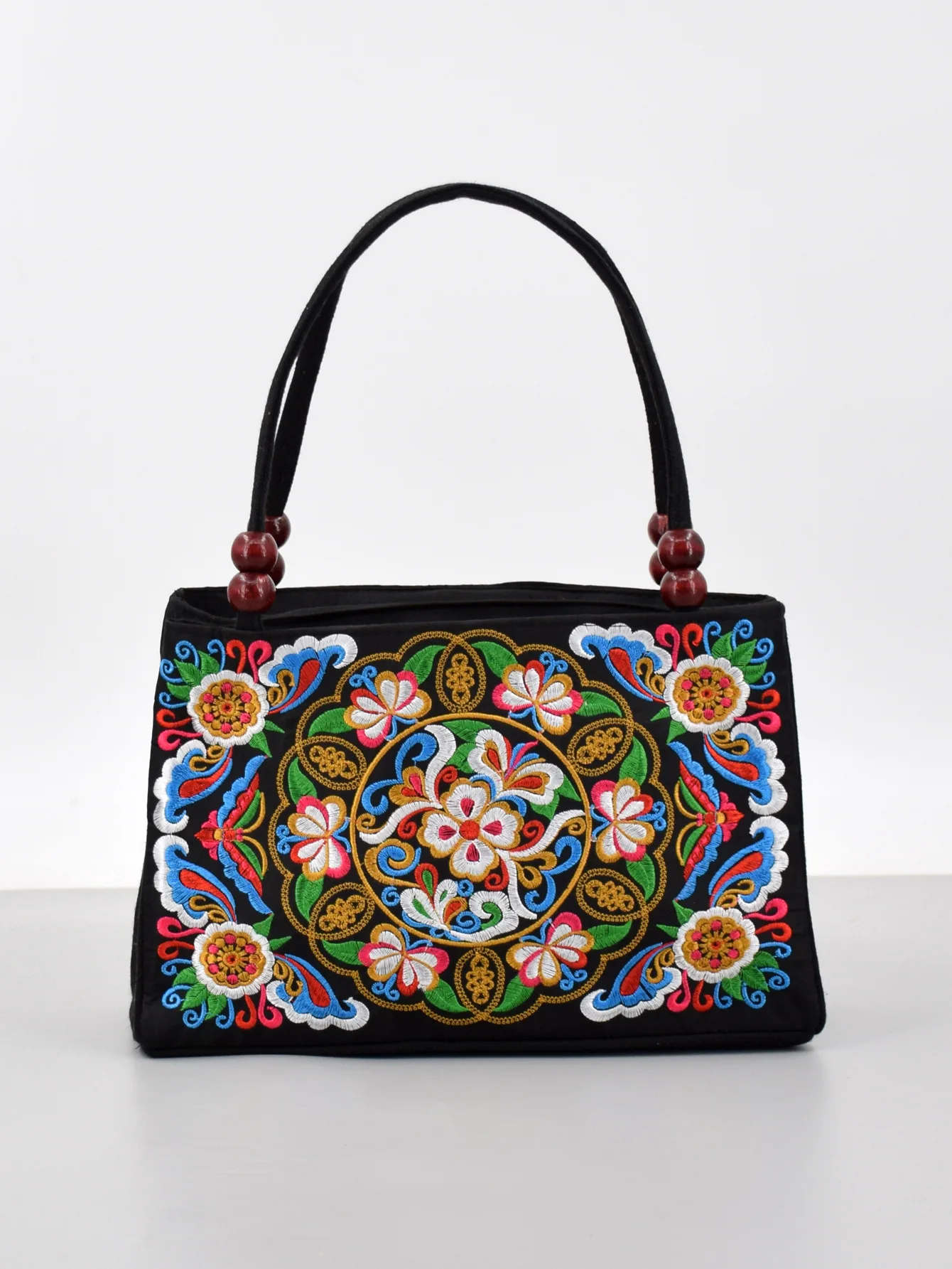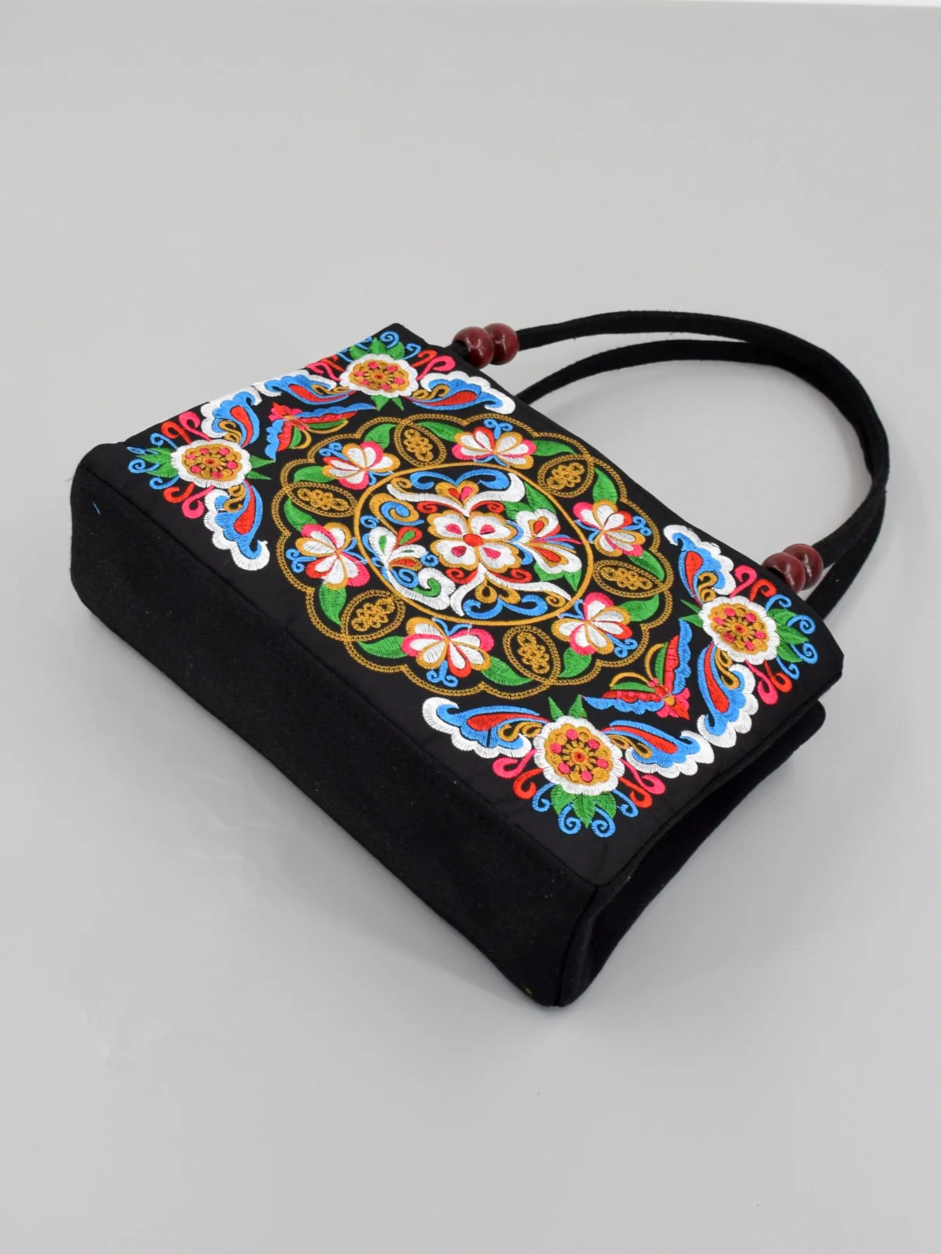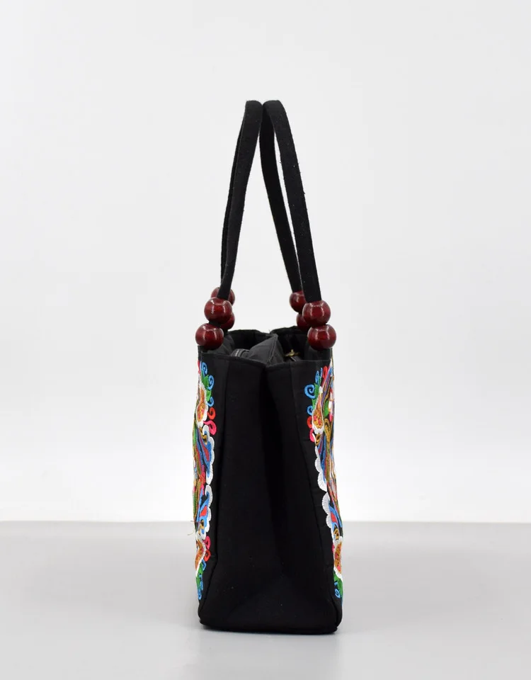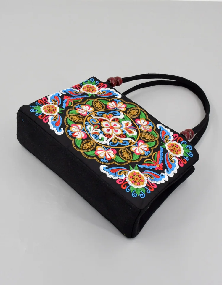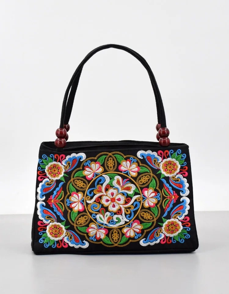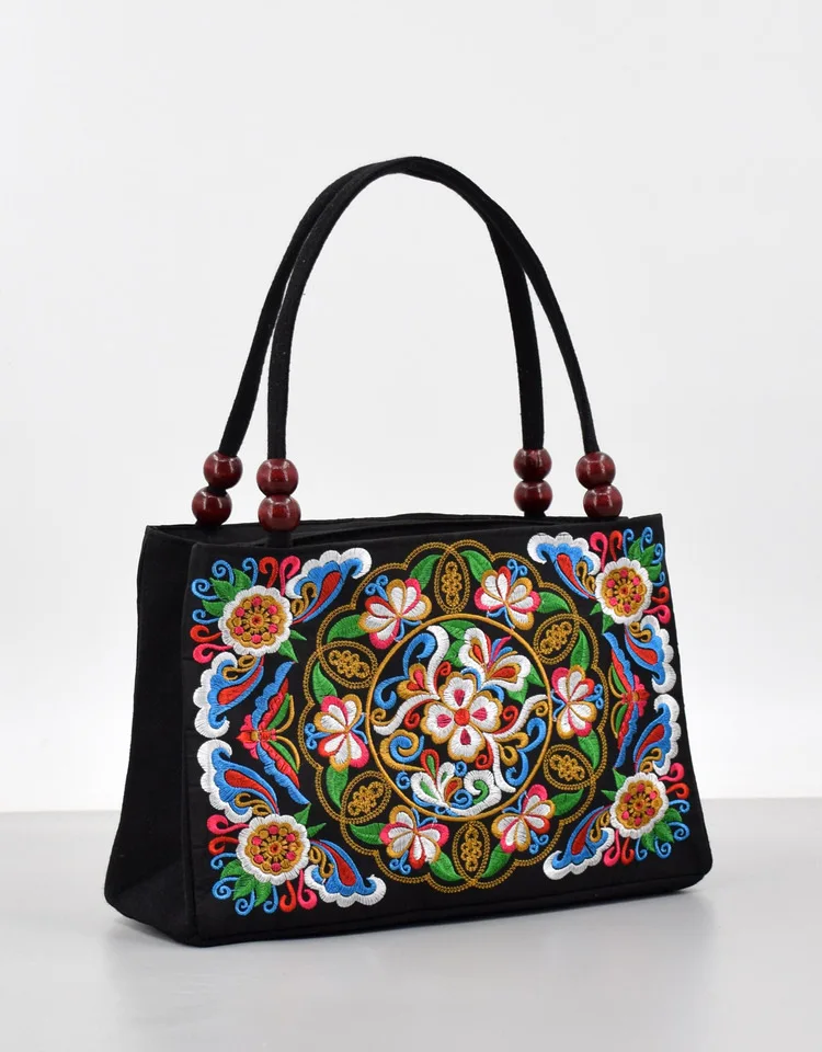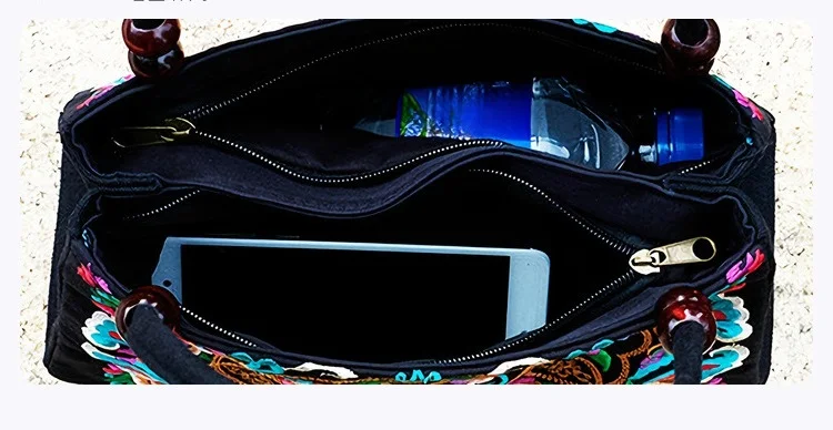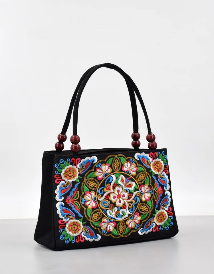 Ethnic-style Double-sided Embroidered Handbag Wooden Bead Accessories Zipper Hand Canvas Bag Portable Mobile Phone Wallet